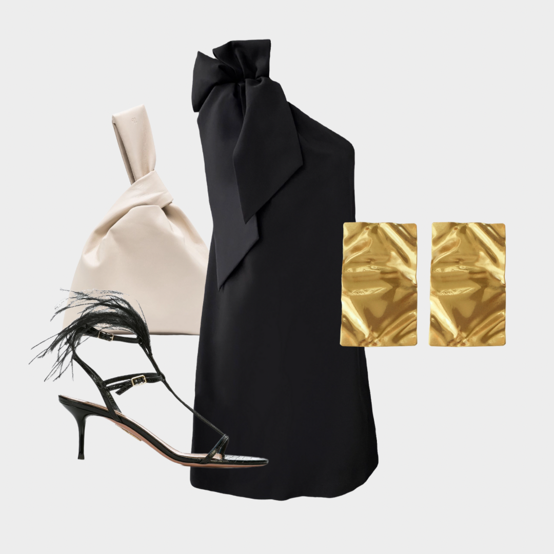 Платье с декоративным бантом на одно плечо в классическом универсальном чёрном оттенке. А-силуэт дарит удобство в движении и комфортную посадку в талии и бёдрах, а ассиметричный вырез красиво подчёркивает шею и ключицы.
