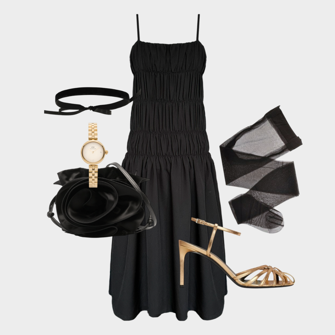 Платье длины макси с декоративной драпировкой на лифе в универсальном классическом чёрном оттенке. Открытые плечи и посадка над грудью красиво подчёркивают шею и ключицы. Силуэт с заниженной талией.